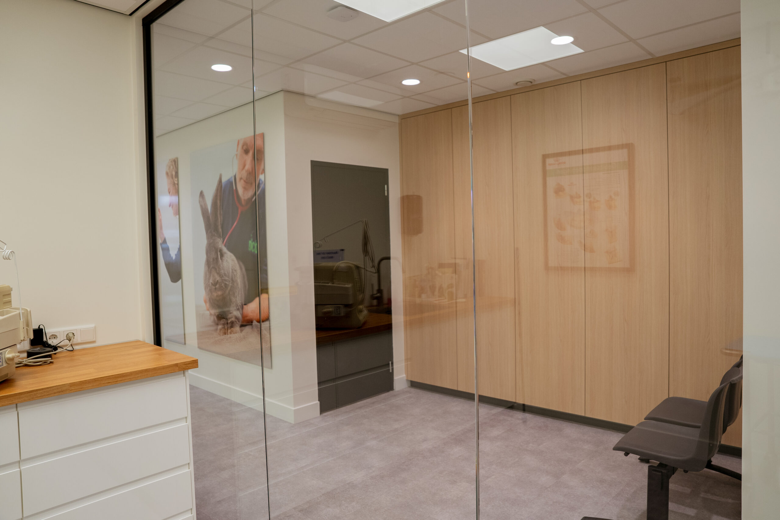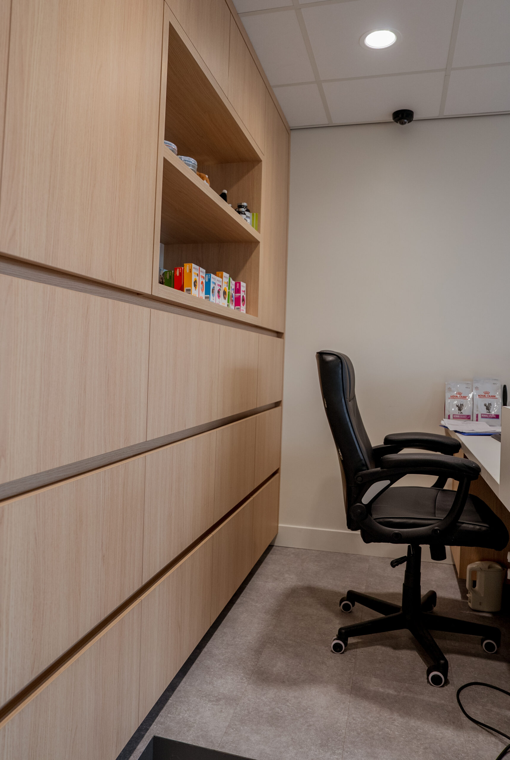 De kastenwand wordt gebruikt als voorraadkast en biedt ruime opbergmogelijkheden voor medische artikelen, dierenvoer en andere benodigdheden.