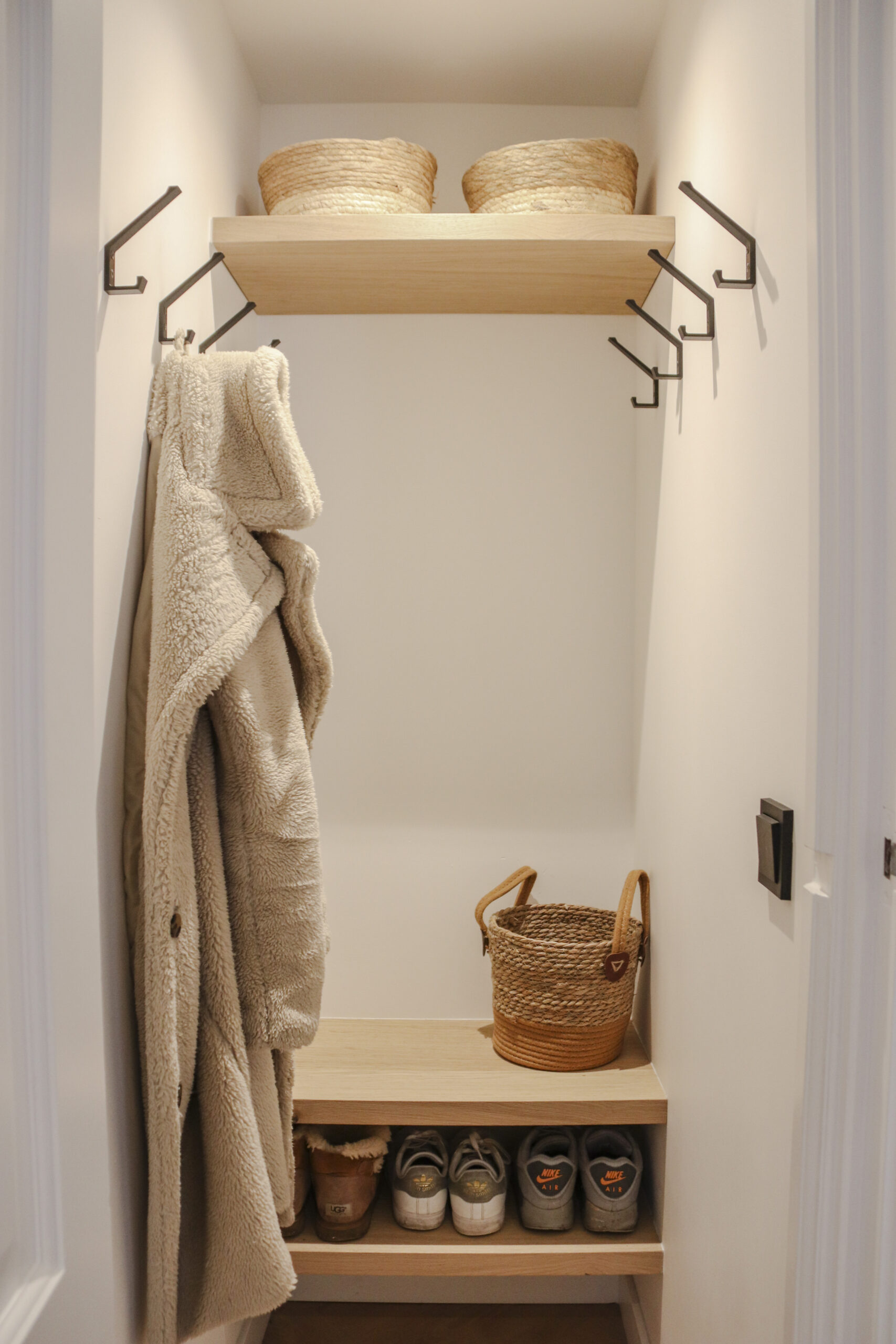 Deze kast voorzien van eiken planken die blind aan de muur zijn bevestigt.
