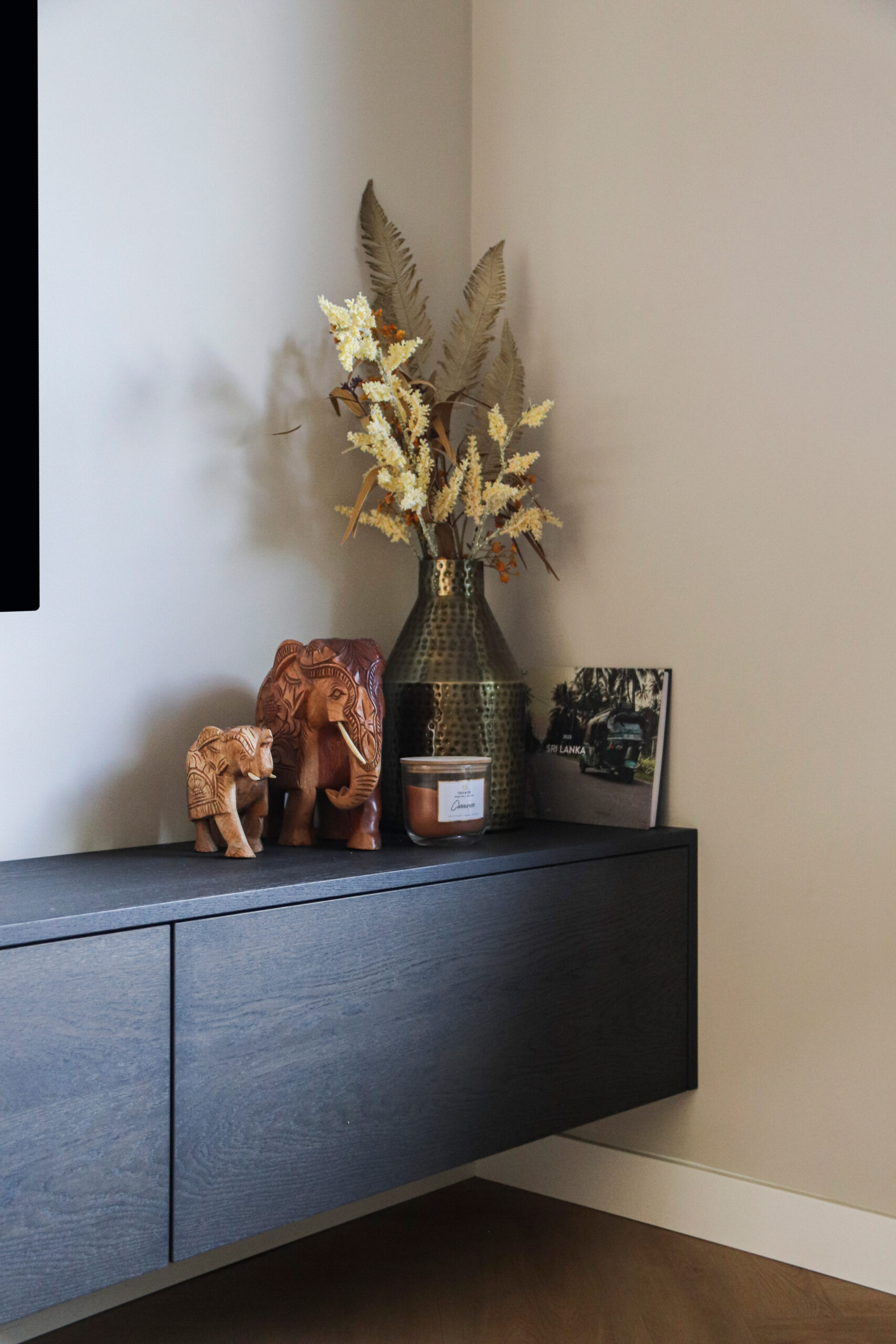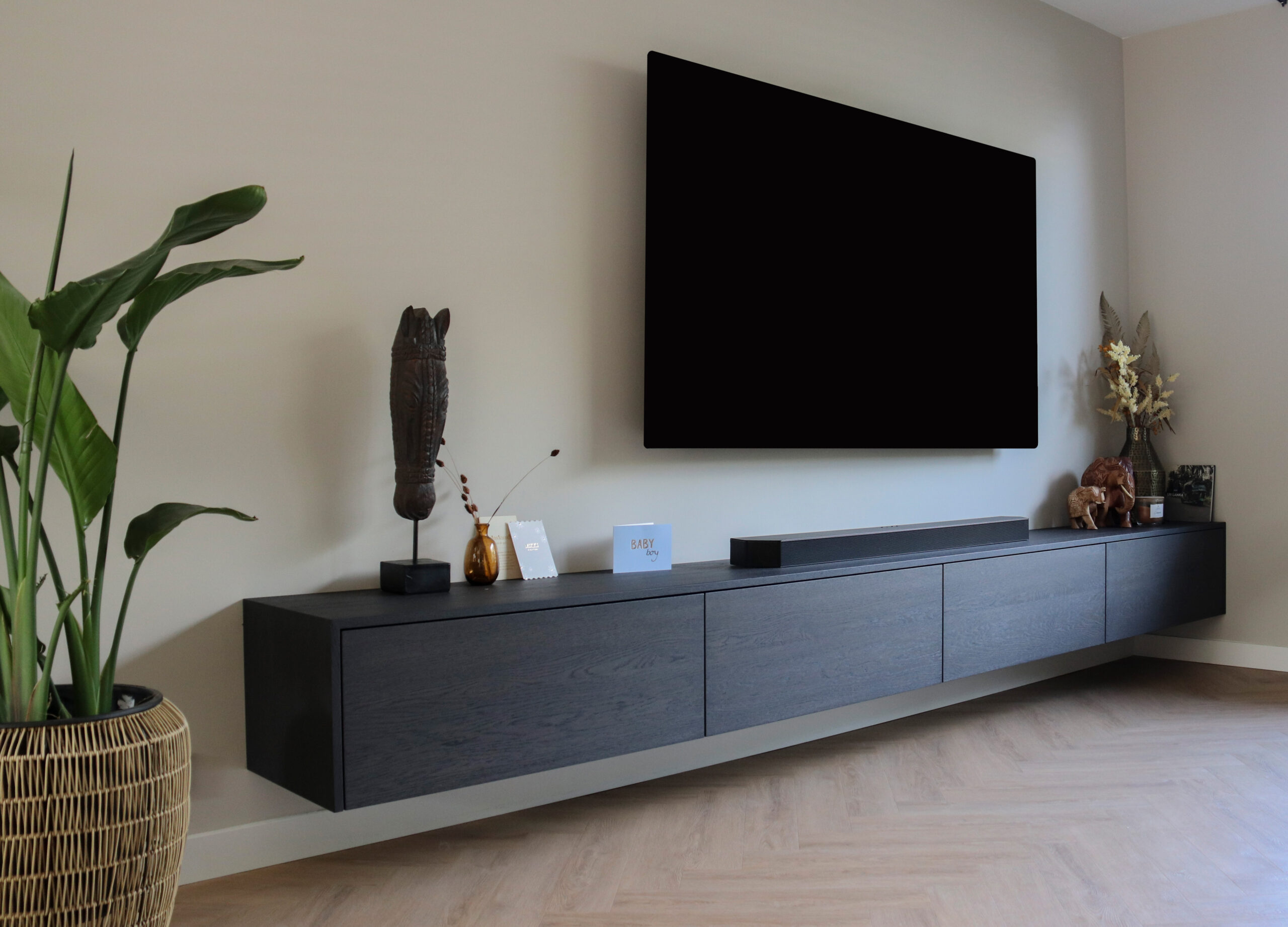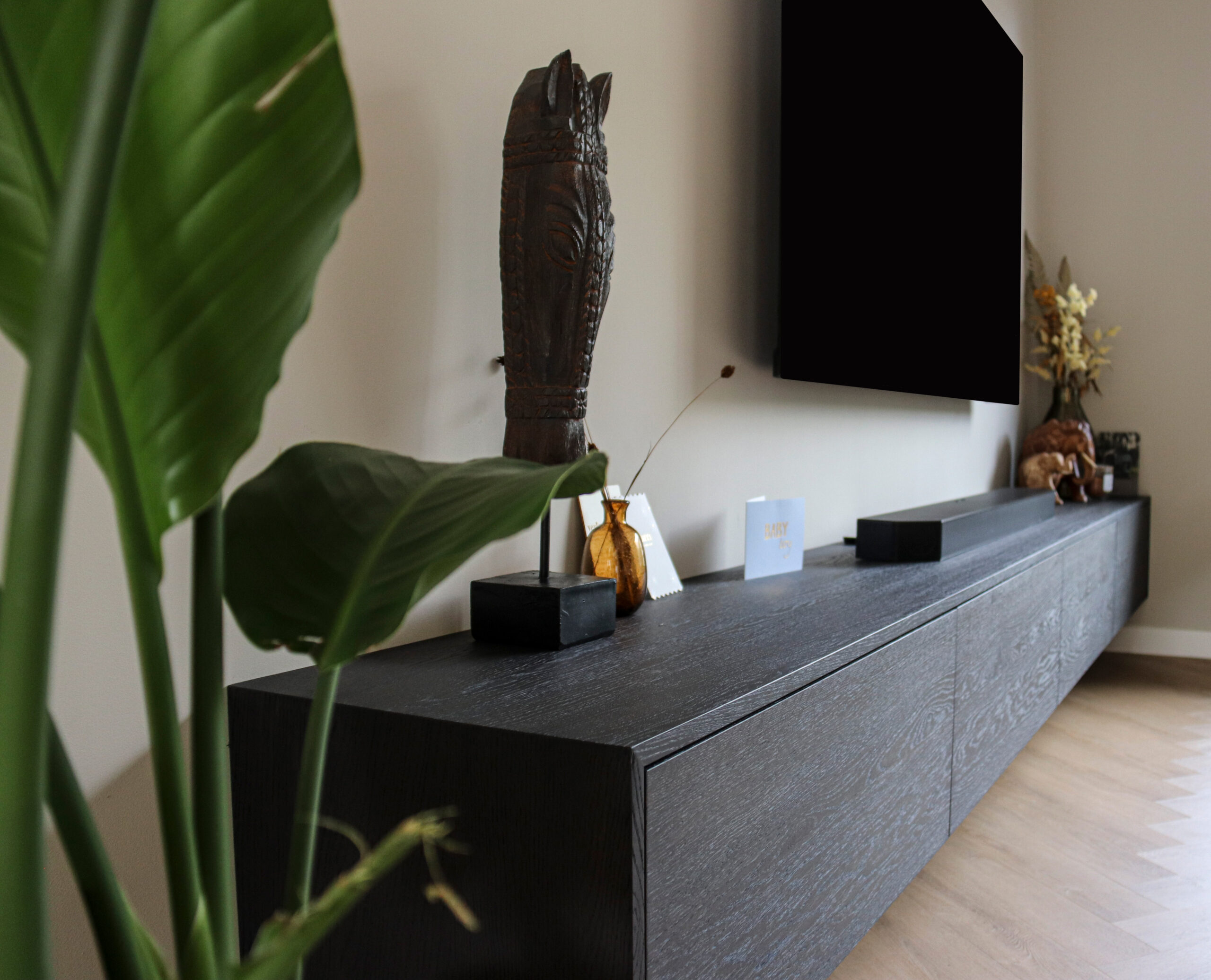 Voor deze klanten, waarvoor we eerder een keuken hebben gemaakt, hebben we nu een zwevend TV-meubel in dezelfde stijl gerealiseerd. De kasten bieden voldoende ruimte voor diverse spullen en apparatuur. De deuren en het blad zijn gemaakt van gefineerd eiken, dat op kleur is gebeitst en afgelakt.